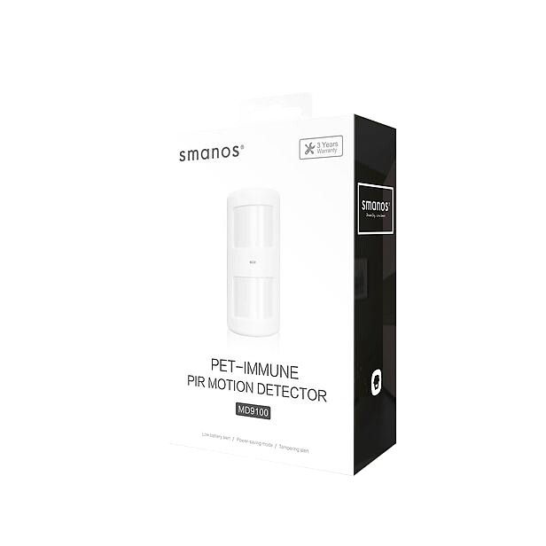 De Smanos MD9100 Draadloze PIR detector is milieu-vriendelijk, betrouwbaar en gemakkelijk te installeren. De sensor verstuurt een automatische melding als de batterijen bijna leeg zijn en vervangen moeten worden.