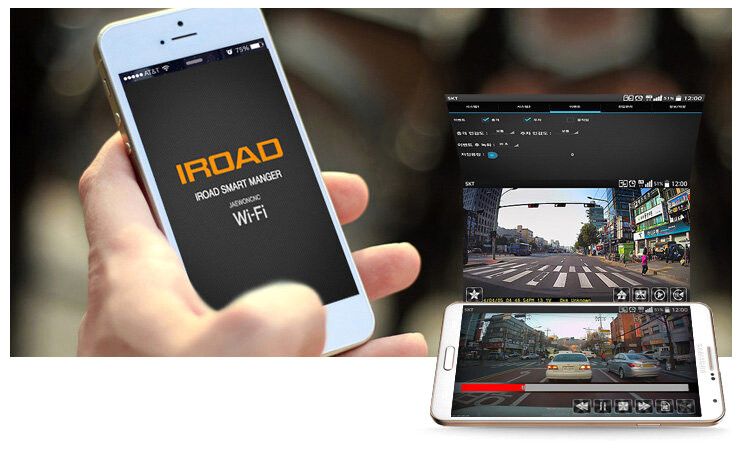- Je kunt de beelden direct naar de IROAD app voor je smartphone of tablet streamen en beheren.