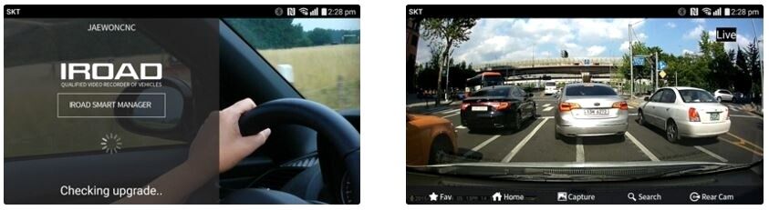 Zodra de IROAD app wordt geopend controleert Je kunt real-time meekijken met zowel de voor- als de app of er een update beschikbaar is en achtercamera. Datum, tijd, voltage, rijsnelheid en